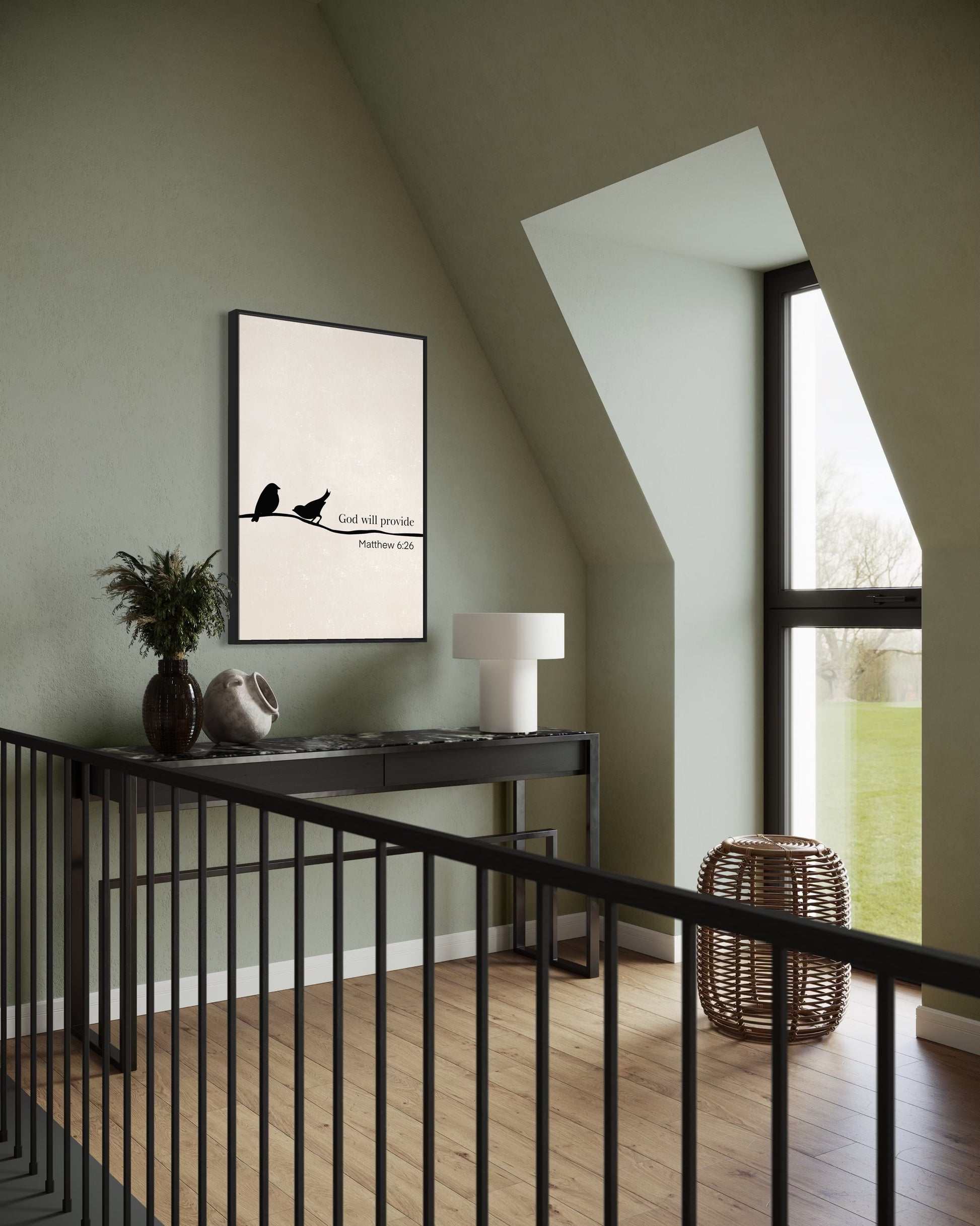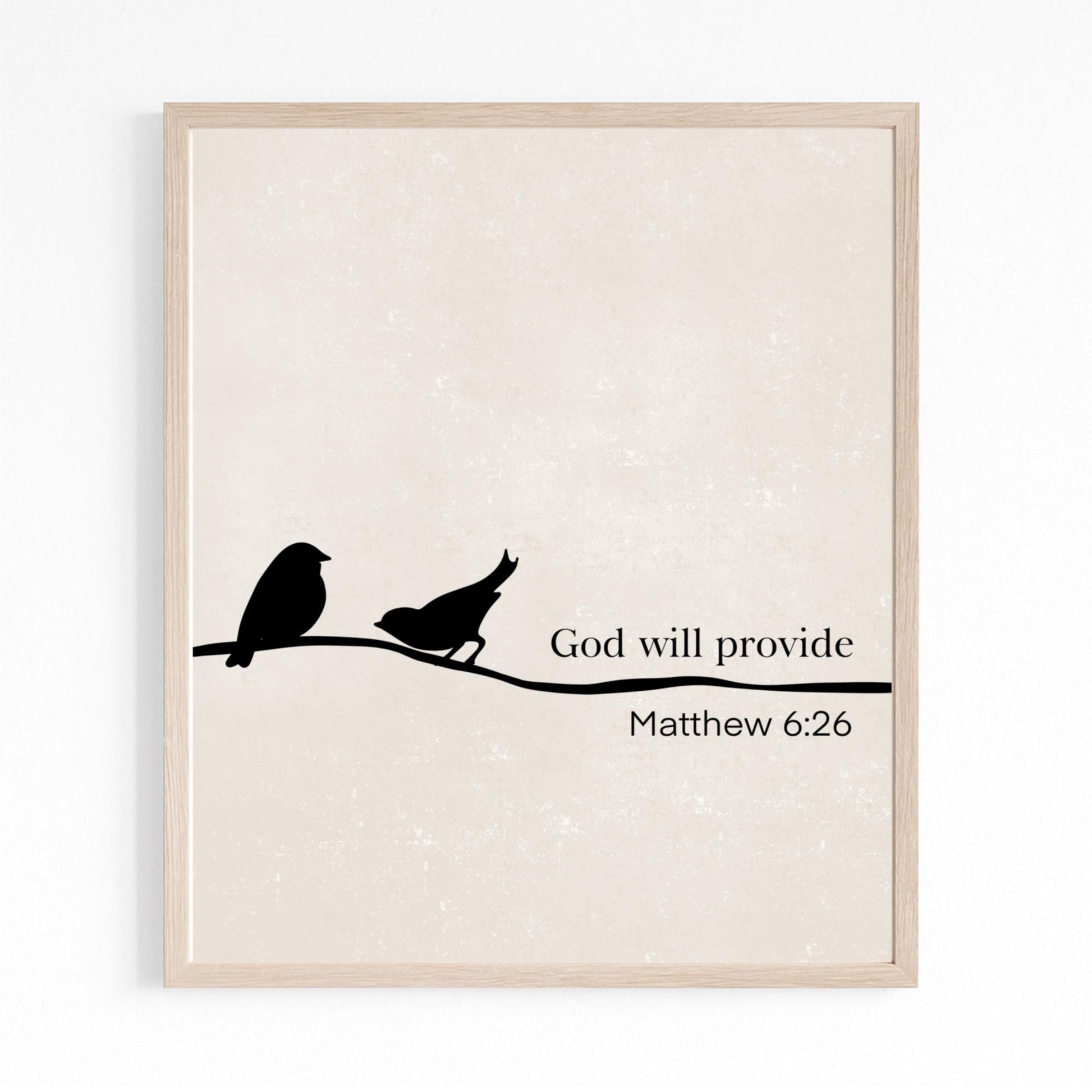 Christian Wall Art – Matthew 6:26 “God Will Provide” Bible Verse with Birds – Minimalist Printable Decor-Beige colour