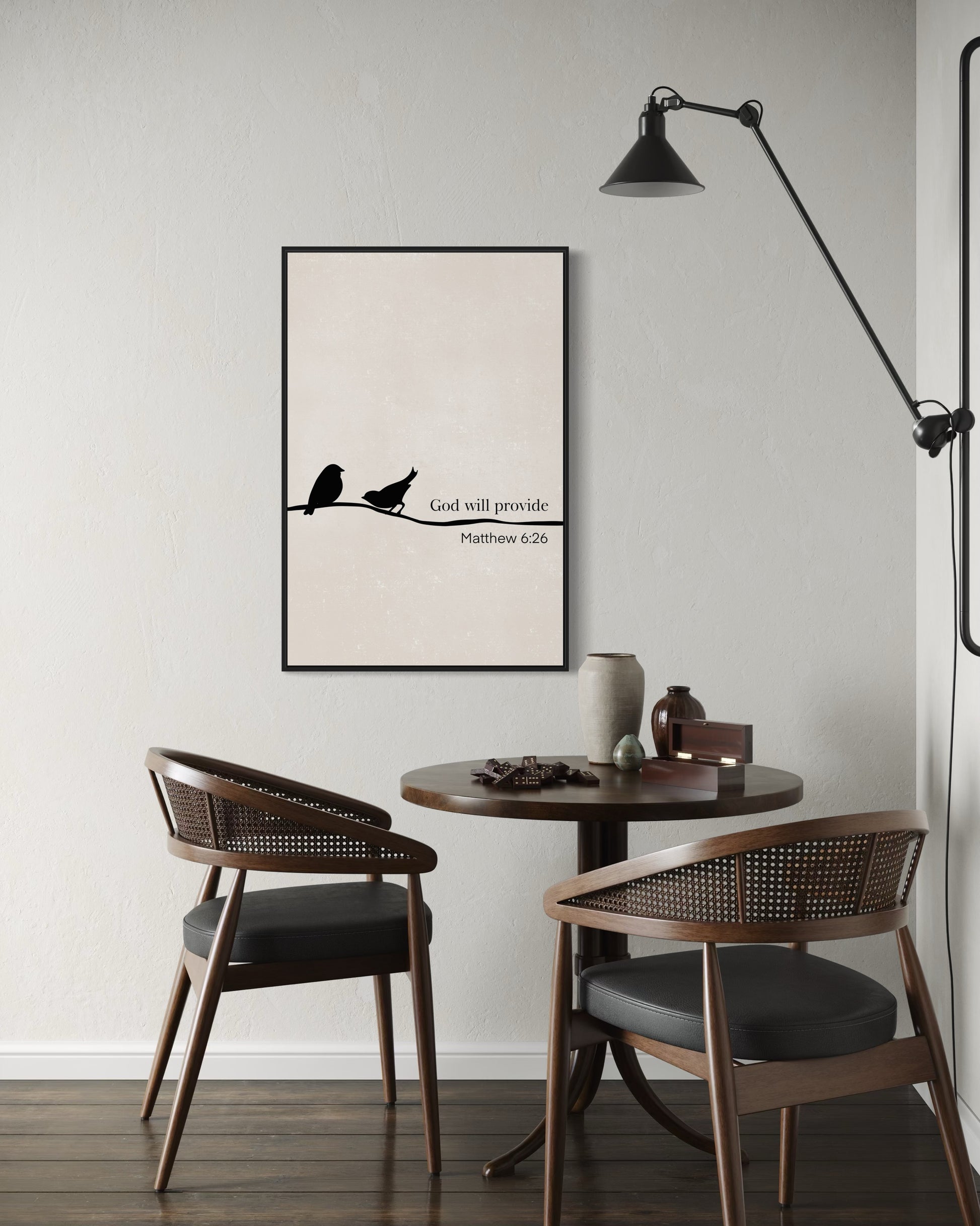 Bring faith and beauty into your home with this minimalist Christian wall art inspired by Matthew 6:26. Featuring two delicate birds on a branch with “God will provide”, this printable artwork is a reminder of God’s care and provision.