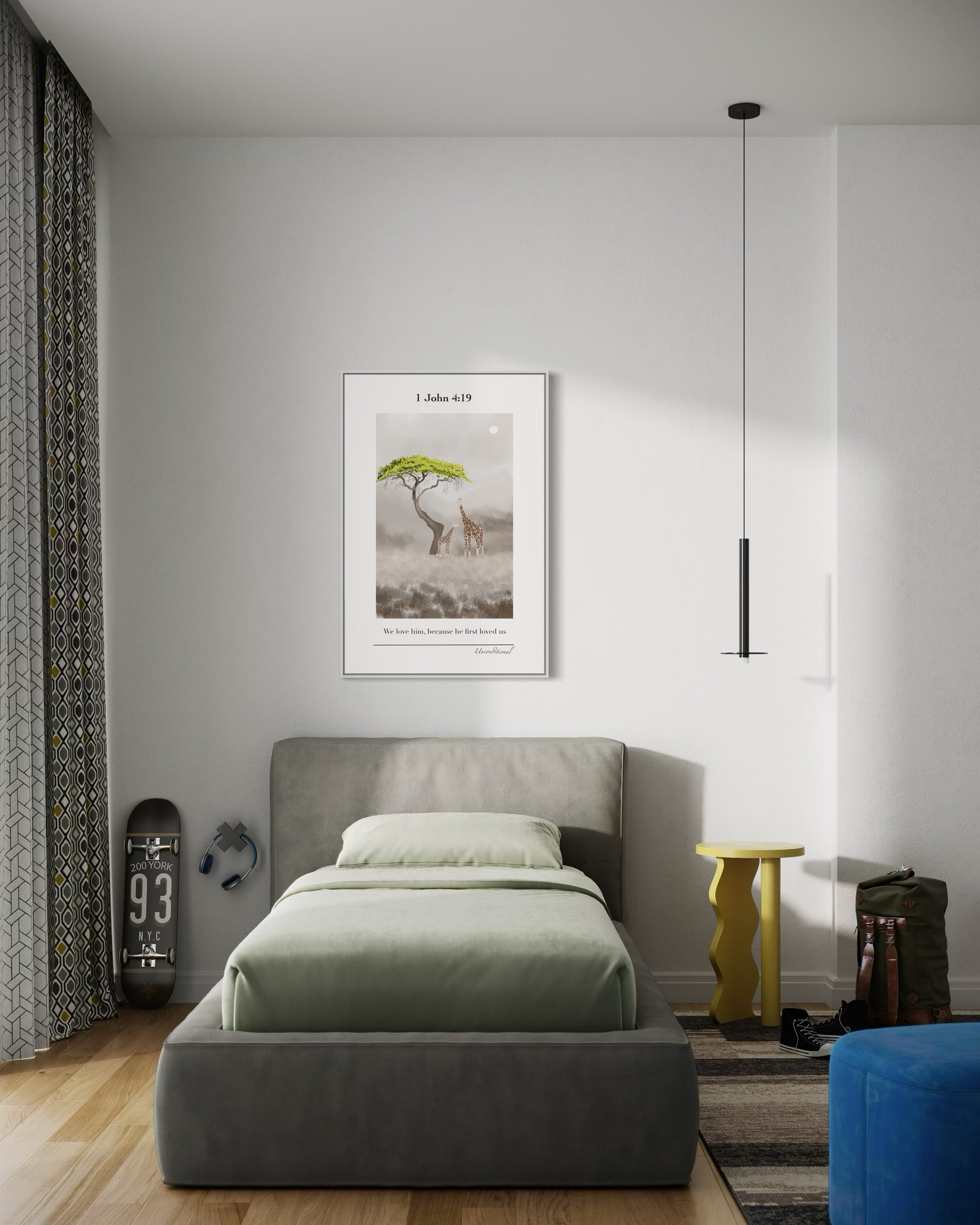 Add a touch of warmth, faith, and tenderness to your space with this digital Christian artwork inspired by 1 John 4:19. Featuring a tall giraffe and a baby giraffe standing together under a vibrant tree in a peaceful landscape. The leaning tree gently shelters. A beautiful visual metaphor for the covering love of God.