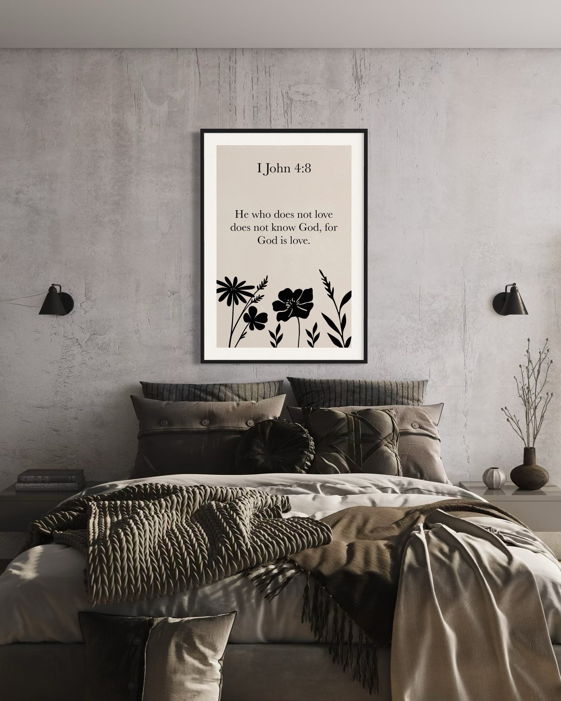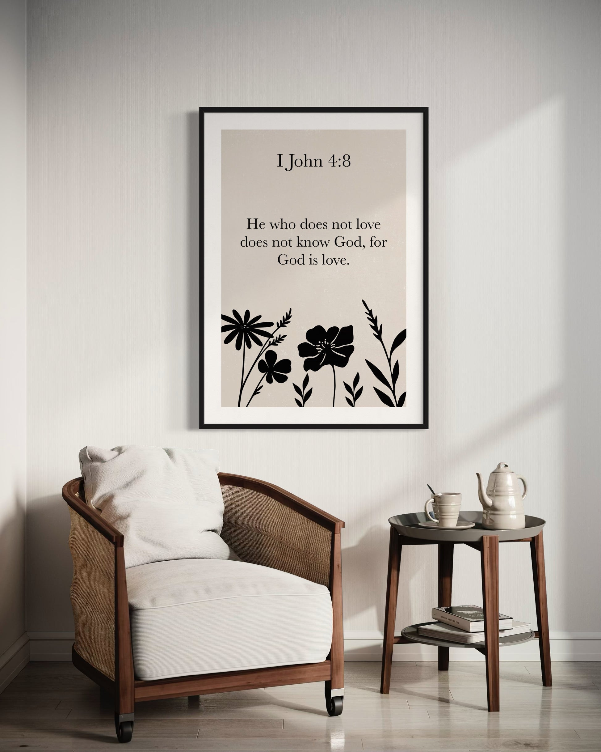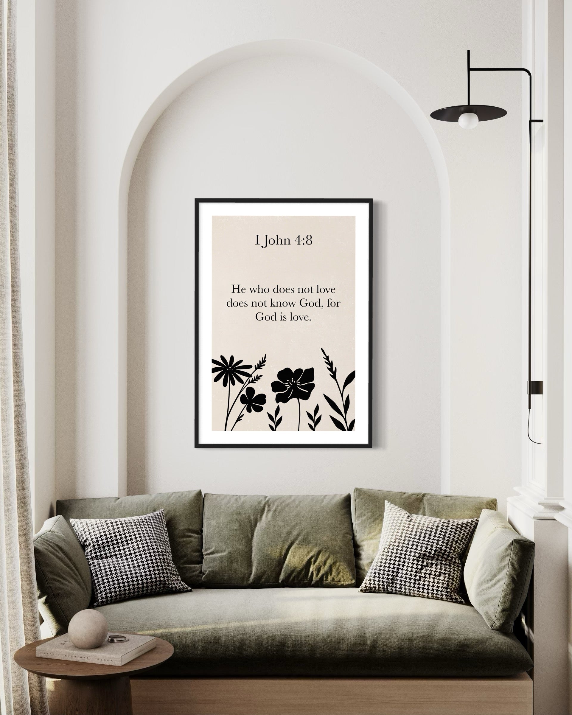 Christian Wall Art – 1 John 4:8 “God Is Love” – Minimalist Bible Verse Print with Black Floral Silhouettes – Neutral Scripture Printable Decor
