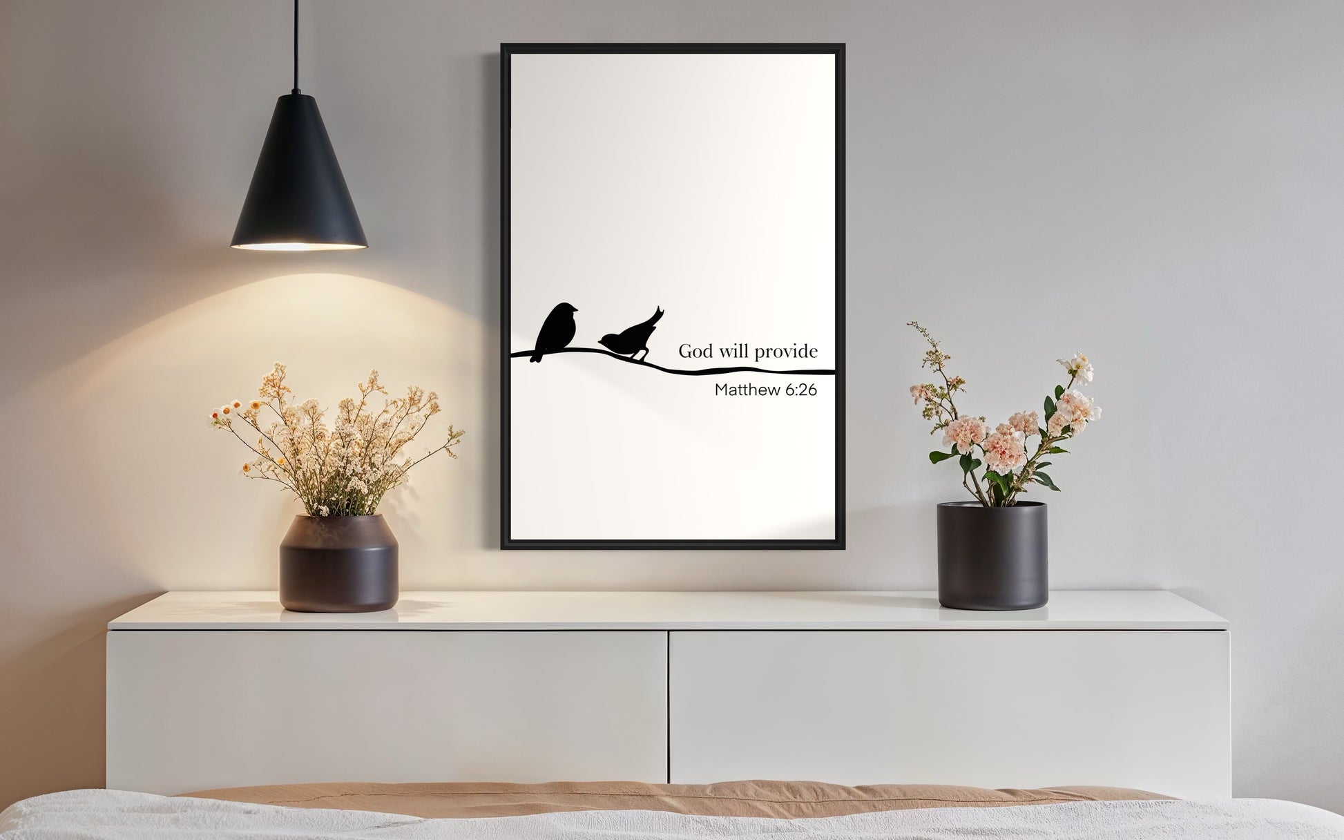 Bring faith and beauty into your home with this minimalist Christian wall art inspired by Matthew 6:26. Featuring two delicate birds on a branch with “God will provide”, this printable artwork is a reminder of God’s care and provision.