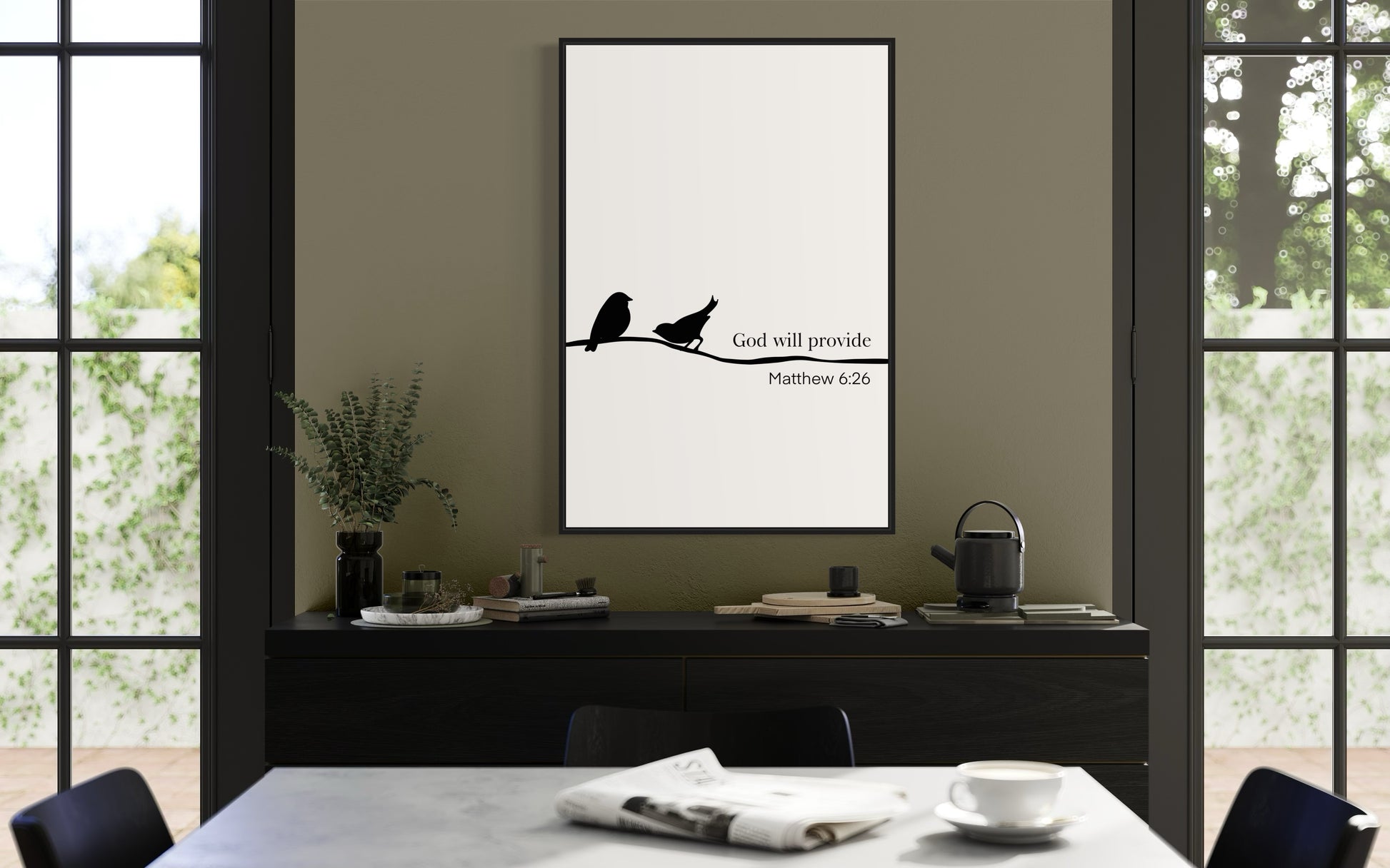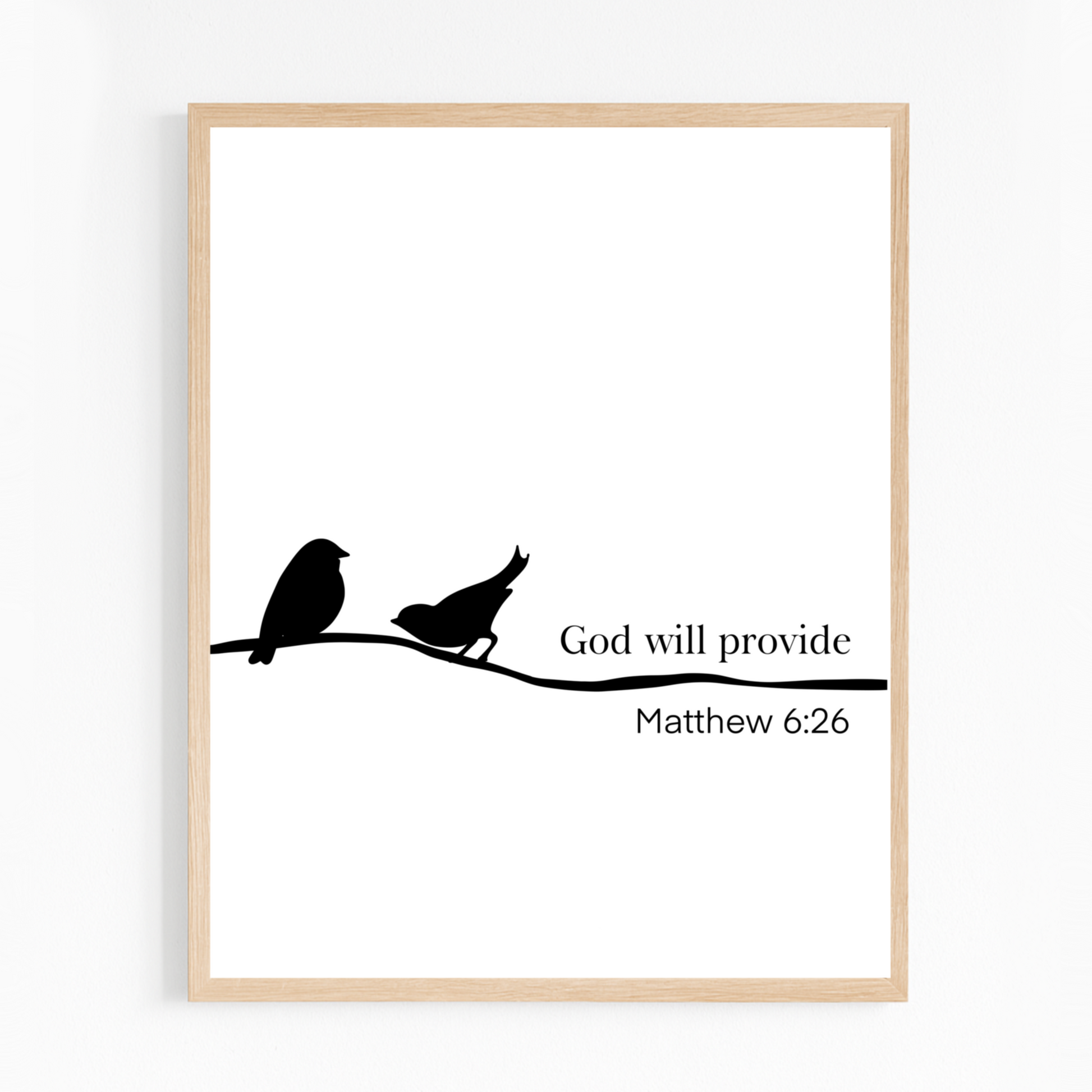 Christian Wall Art – Matthew 6:26 “God Will Provide” Bible Verse with Birds – Minimalist Printable Decor